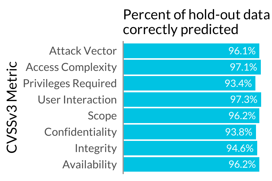The model was developed using time stratified 8-fold cross validation on the data set of vulnerabilities which had both CVSS v3 metrics. We were able to achieve an accuracy of 75% for predicting the exact CVSSv3 vector. Each individual sub component was predicted with greater than 93% accuracy.
