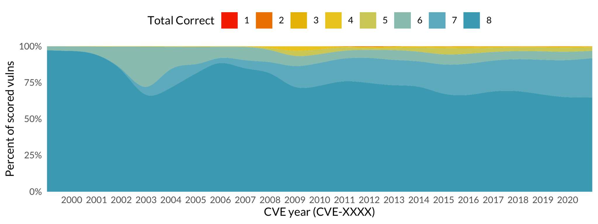 This equates to achieving 88% accuracy when considering the vulnerability “severity” (None/Low/Medium/High/Critical). Moreover for 99.9% of the predictions the ANN was able to predict at least 4 out of the 8 metric values correctly. The model also performed well across all time periods.