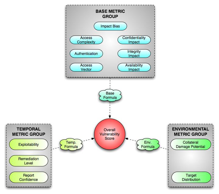 A metric is a constituent component or characteristic of a vulnerability that can be quantitatively or qualitatively measured. These atomic values are clustered together in three separate areas: a base group, a temporal group, and an environmental group. The base group contains all of the qualities that are intrinsic and fundamental to any given vulnerability that do not change over time or in different environments. The temporal group contains the characteristics of a vulnerability that are time-dependent and change as the vulnerability ages. Finally, the environmental group contains the characteristics of vulnerabilities that are tied to implementation and environment. The final adjusted score represents the threat a vulnerability presents at a particular point in time for a specific environmental condition. The metric groups are shown below.