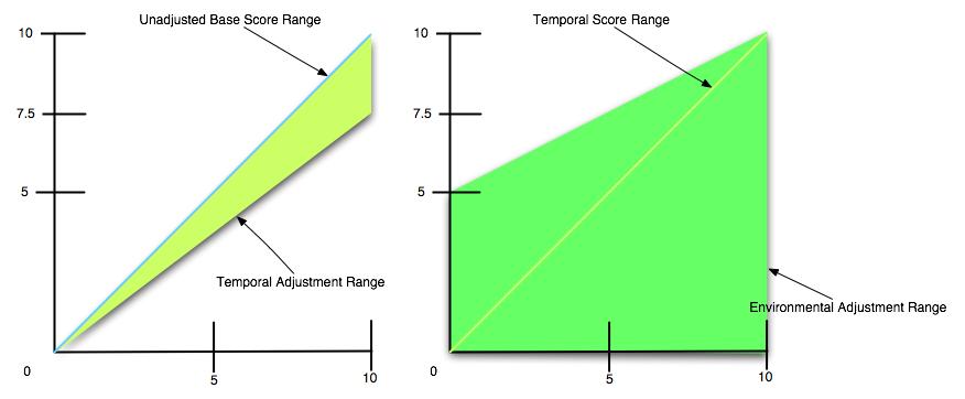 The temporal score adjusts the base score by including factors that may change over time. The temporal score will be less than or equal to the base score; that is, the temporal metrics serve only to reduce the base score by a maximum of 33%. This is shown at the end of the scoring section.
